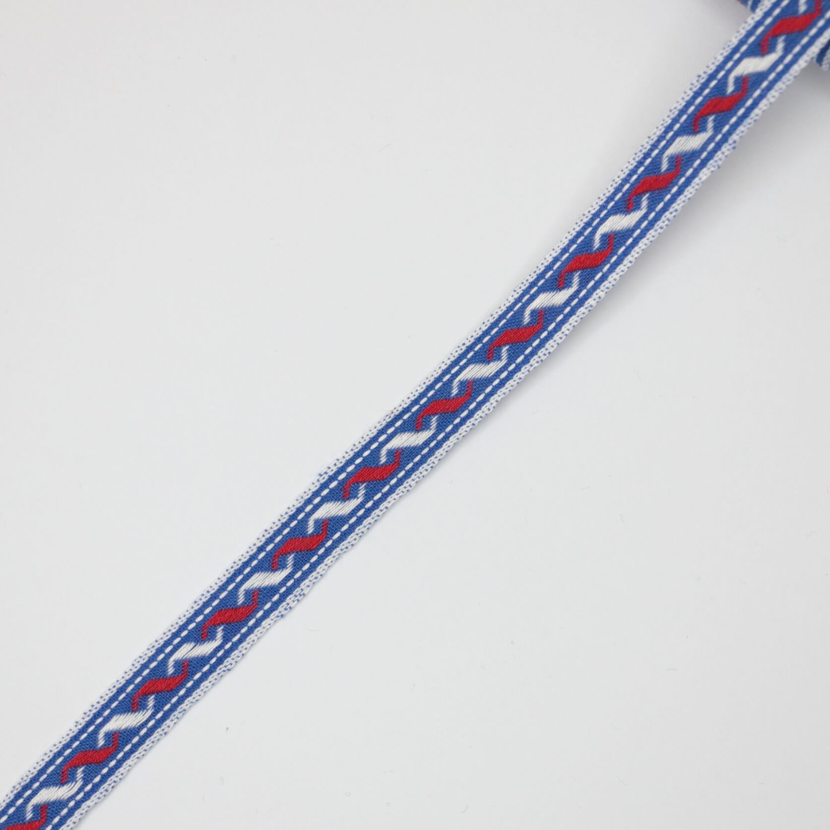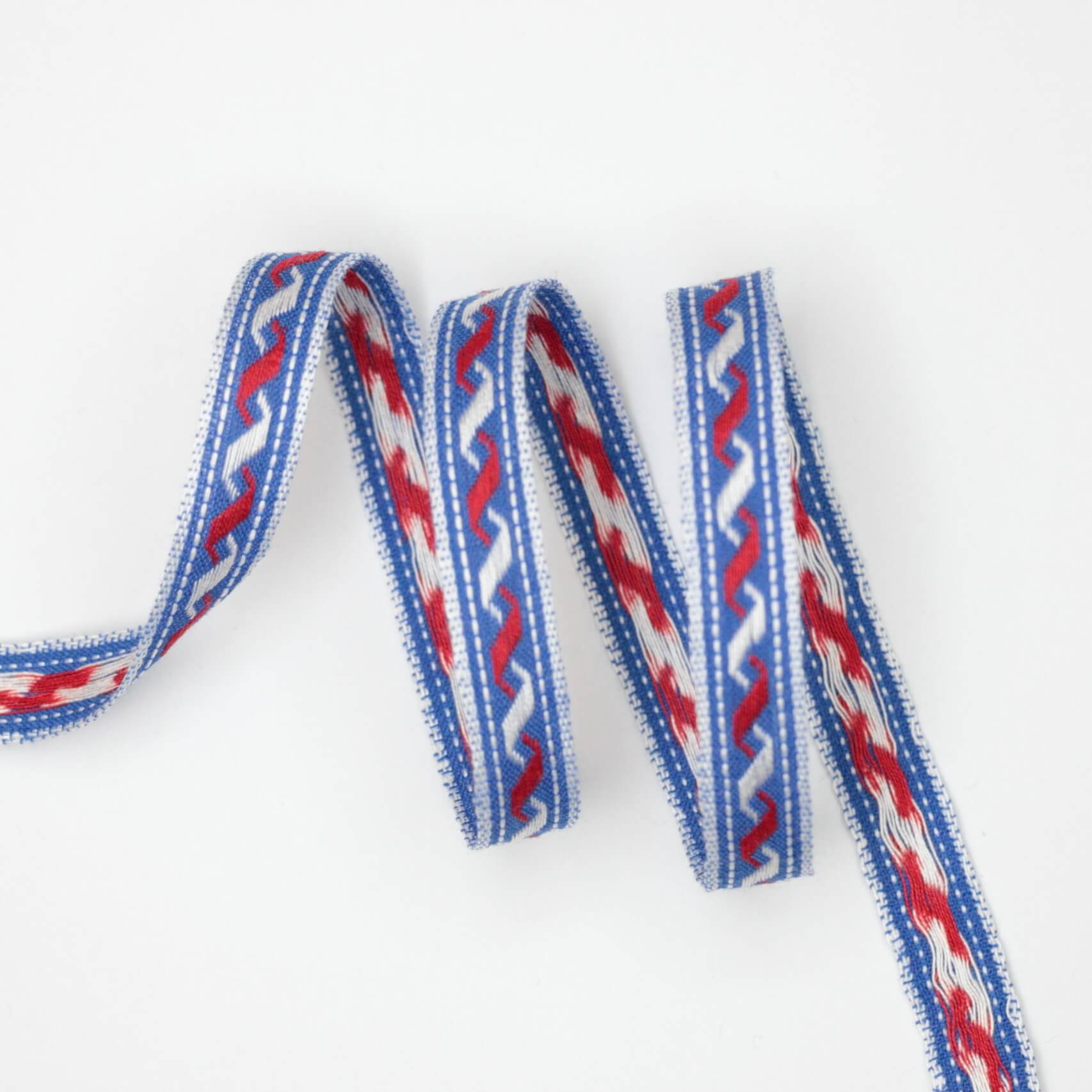 Decorative braid featuring a classic red, white, and blue design, ideal for trimming garments, home décor projects, and craft applications. This 11mm width offers versatile coverage for binding edges, adding detail to cushions, or embellishing accessories. Sold by the metre, allowing you to purchase exactly what you need. Quality construction ensures durability through washing and wear, making it a reliable choice for both professional seamstresses and keen makers.