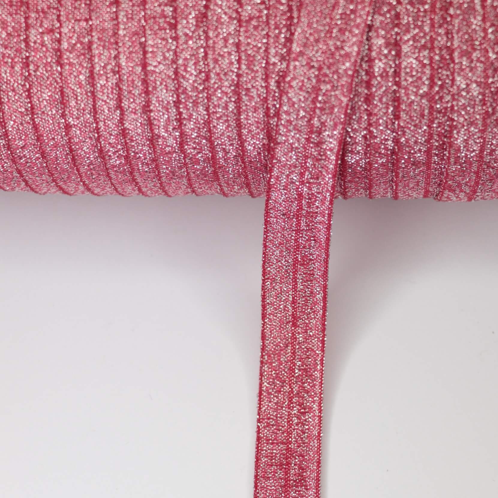 15mm Red Glitter Foldover Elastic 3m Versatile foldover elastic with a vibrant red glitter finish, ideal for binding edges on activewear, swimwear, and children's garments. The 15mm width provides substantial coverage whilst remaining flexible enough for curved seams. Pre-folded design eliminates the need for additional folding, streamlining your sewing process and ensuring consistent, professional results. This 3-metre length offers ample material for multiple projects or generous binding applications. The glitter detailing adds decorative appeal without compromising durability or comfort against skin. Perfect for both functional and embellished finishes on knit fabrics.
