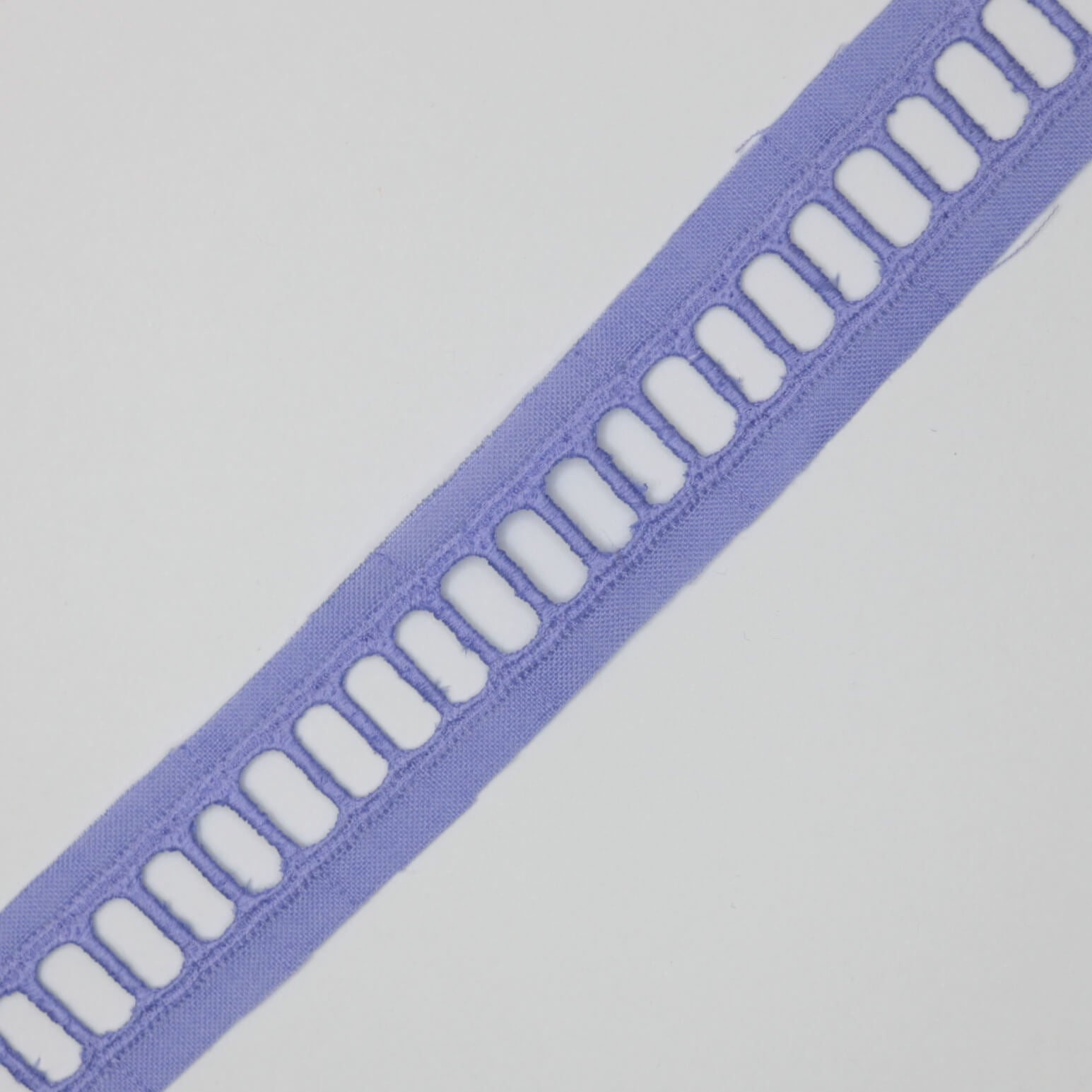 Our 22mm lilac guipure-style lace trim featuring 9mm perforations designed for ribbon threading. Sold by the metre, this delicate trim combines traditional lace aesthetics with practical functionality, the evenly spaced holes allow you to weave contrasting ribbons through for customised embellishment on garments, accessories, or soft furnishings. The guipure construction offers structure and definition, making it ideal for both decorative and functional applications in dressmaking, lingerie, and craft projects.