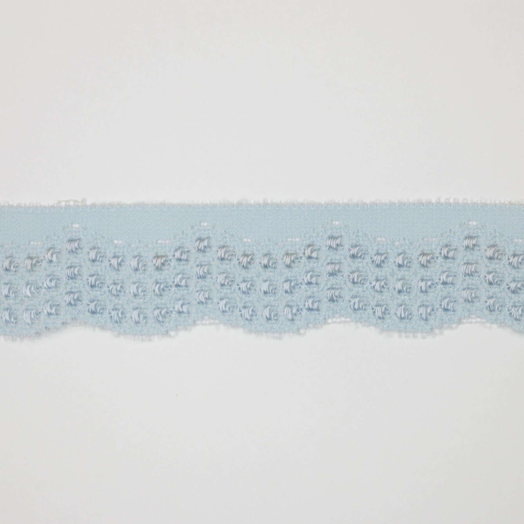 Delicate stretch lace trim in soft light blue, featuring an elegant shiny-spot pattern that catches the light beautifully. At 30mm wide, this versatile notion works perfectly for lingerie edging, garment embellishment, or decorative applications where subtle texture and movement matter. The inherent stretch ensures comfortable wear and easy application to curved seams.