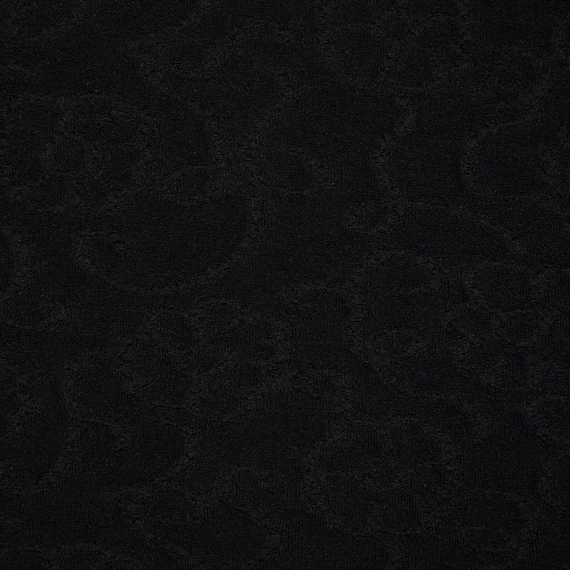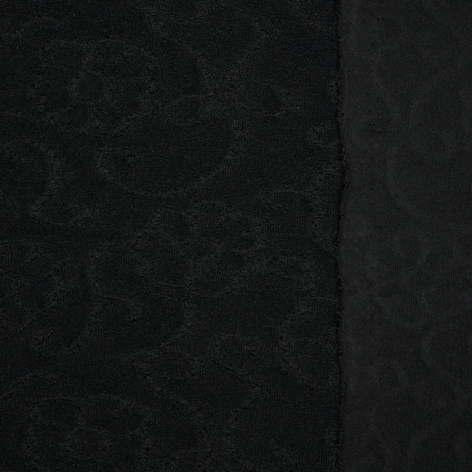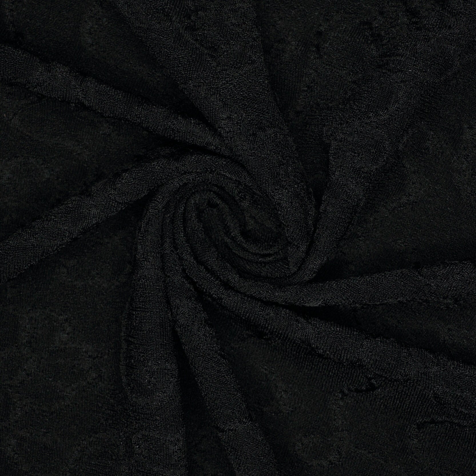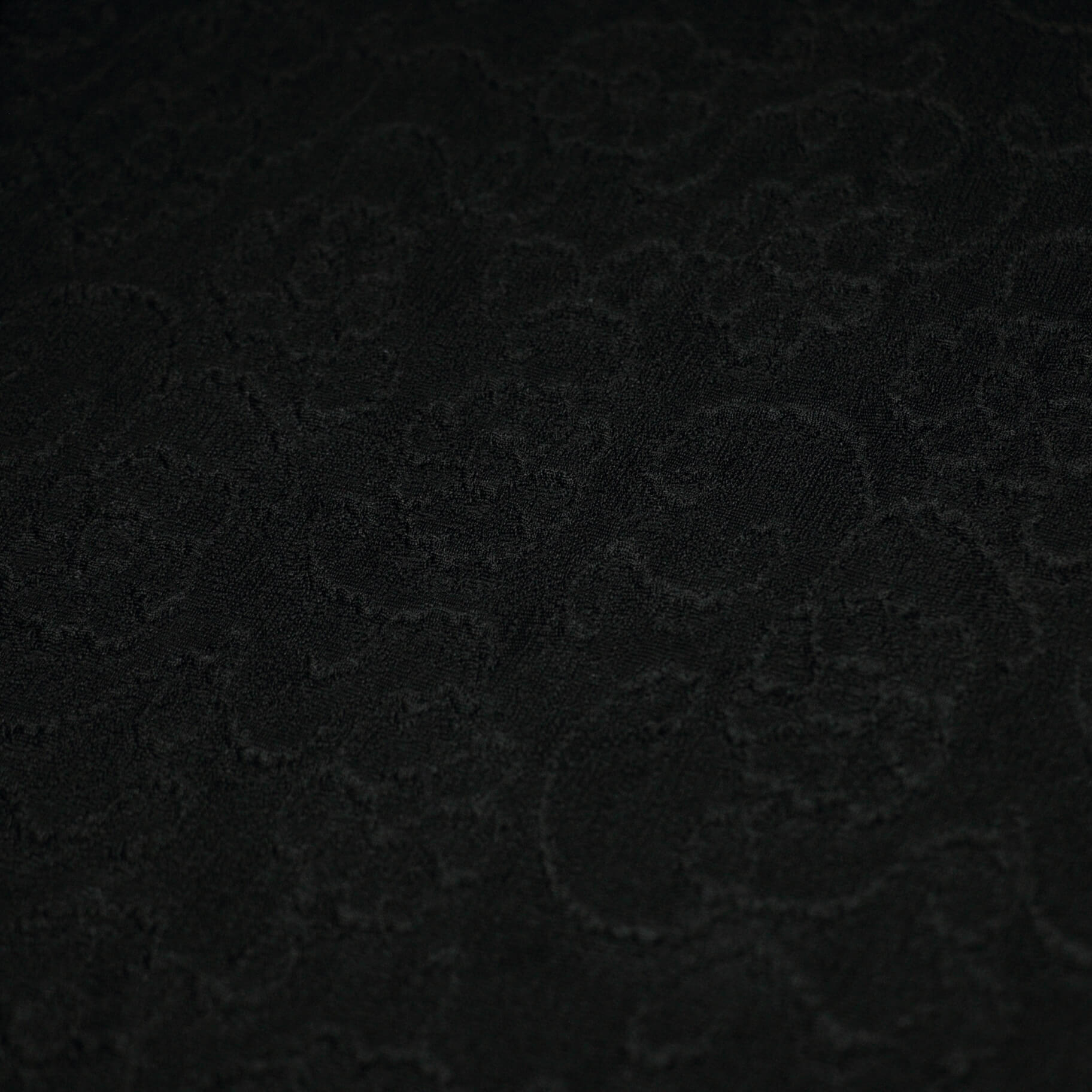 Our black embossed floral knit jersey is a sophisticated knit jersey featuring an embossed floral motif on a classic black ground. The two-way stretch construction delivers comfort and recovery, making it ideal for fitted garments, activewear, and everyday wear. Soft to the touch with excellent drape, this versatile fabric works beautifully for dresses, tops, and layering pieces. The embossed texture adds visual interest whilst maintaining a refined aesthetic.