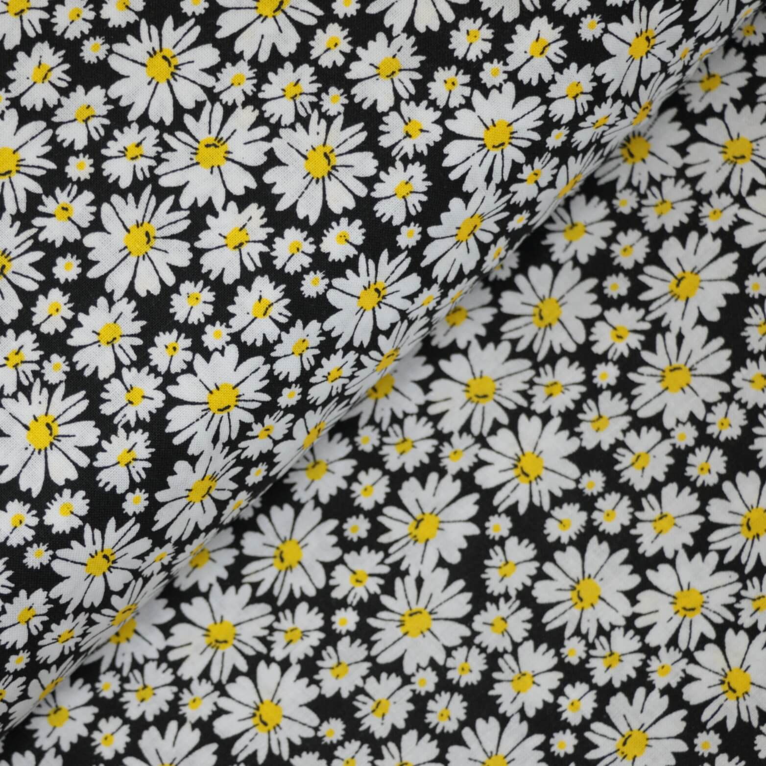 Our daisies on black 100% Cotton fabric features a classic daisies print on a rich black background. Made from soft, woven cotton, this non-stretch material offers both comfort and durability. Ideal for a variety of sewing projects, it provides a natural feel and breathability, making it perfect for garments, home décor, and accessories that require a sturdy yet gentle fabric.