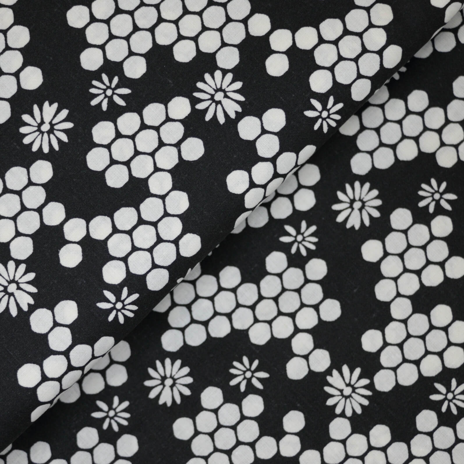 This 100% cotton fabric features a striking white honeycomb pattern on a deep black background. Its soft, woven texture offers comfortable breathability and durability, making it ideal for quilting, apparel, and home décor projects. The non-stretch construction ensures stable shaping and easy handling during stitching, perfect for precise, expert-level craftsmanship.