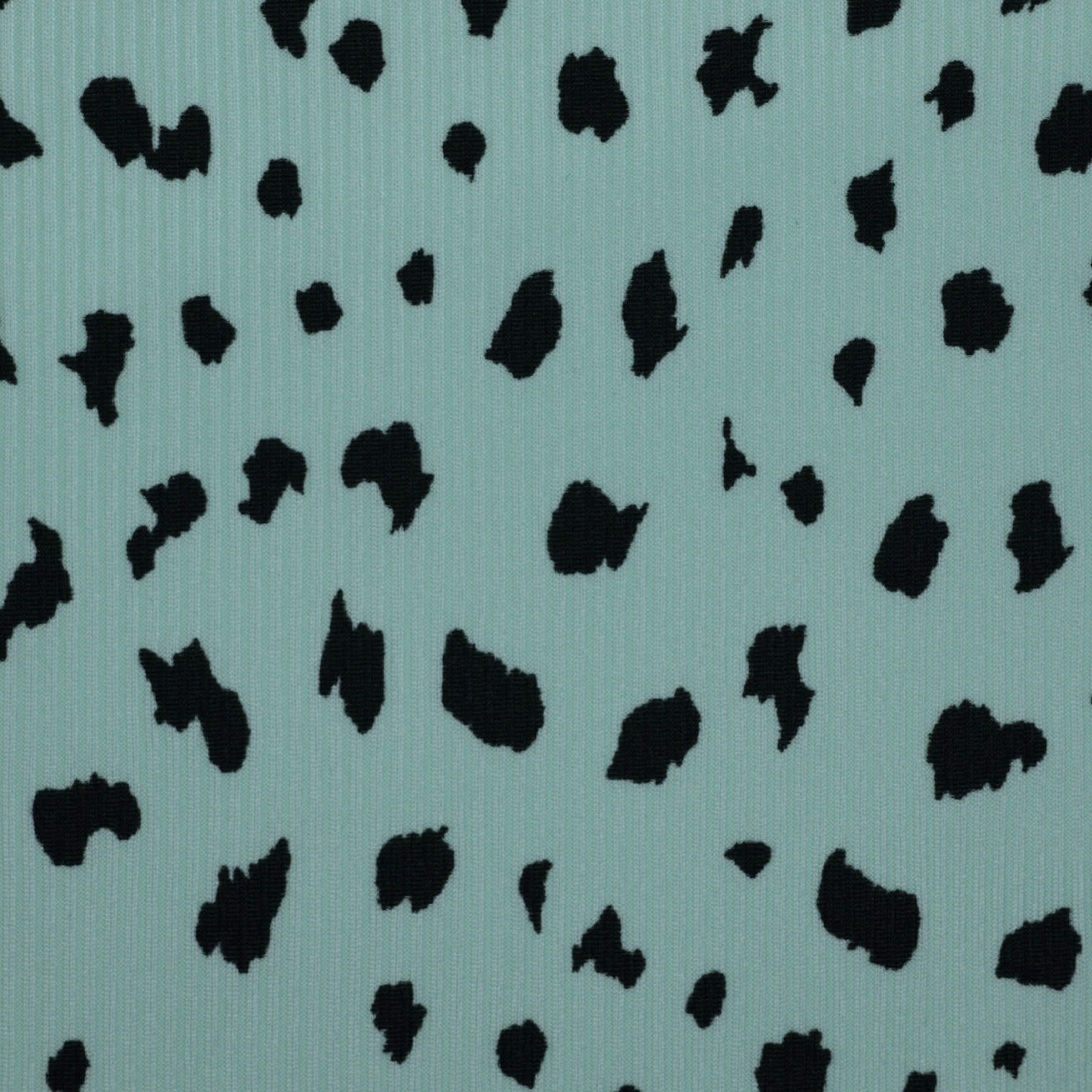 Mint blue animal spot print ribbed jersey with exceptional two-way stretch and soft hand-feel. This premium knit fabric combines comfort with versatility, ideal for fitted garments, activewear, and everyday basics. The ribbed structure provides recovery and durability, whilst the gentle stretch ensures ease of movement.