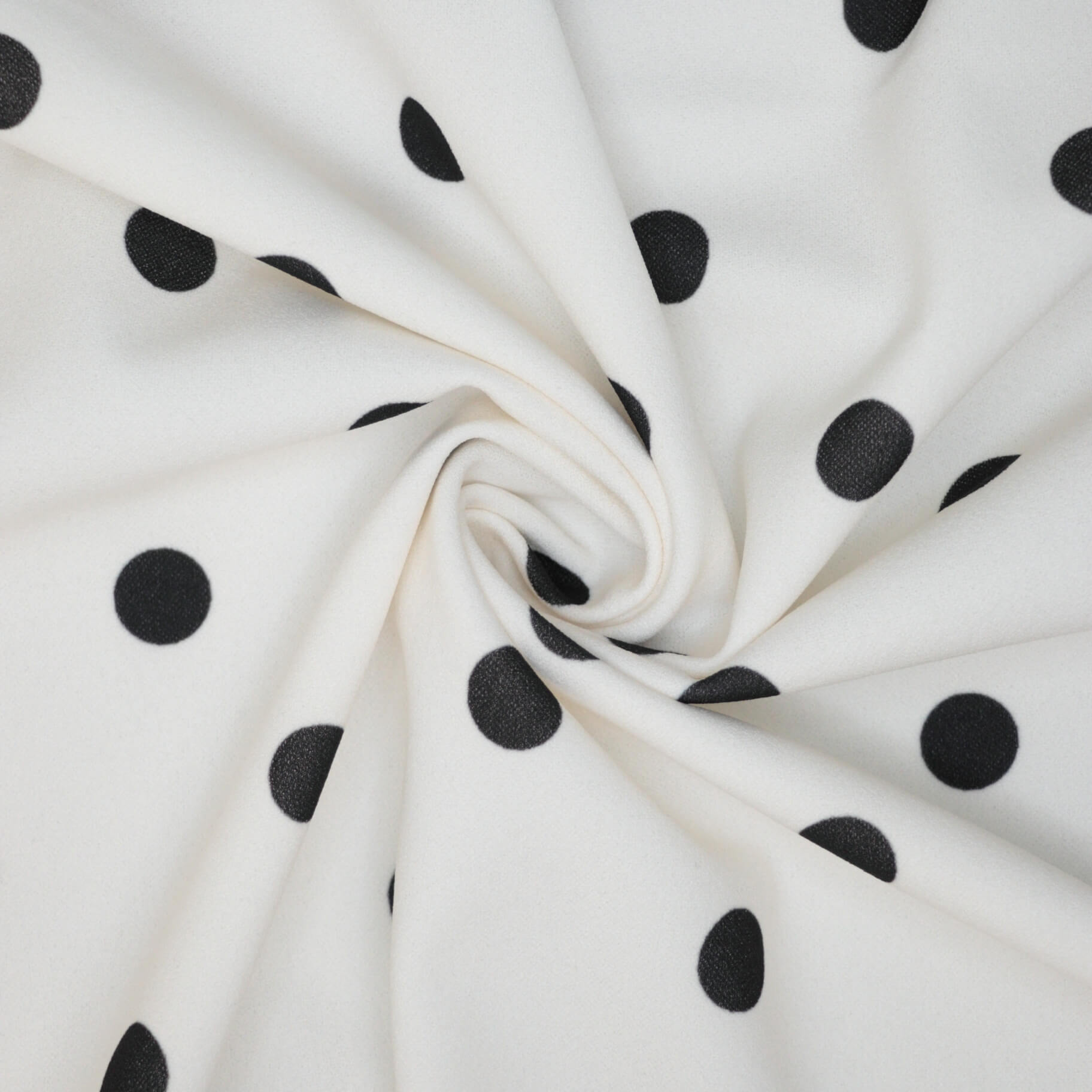 Off-white scuba crepe with striking black polka dots, engineered for versatility and comfort. This two-way stretch fabric delivers exceptional recovery and drape, making it ideal for fitted garments, activewear, and structured pieces. The soft hand feel combined with the crepe's natural texture creates visual interest whilst maintaining a refined aesthetic. Perfect for dressmakers seeking a fabric that balances structure with movement.