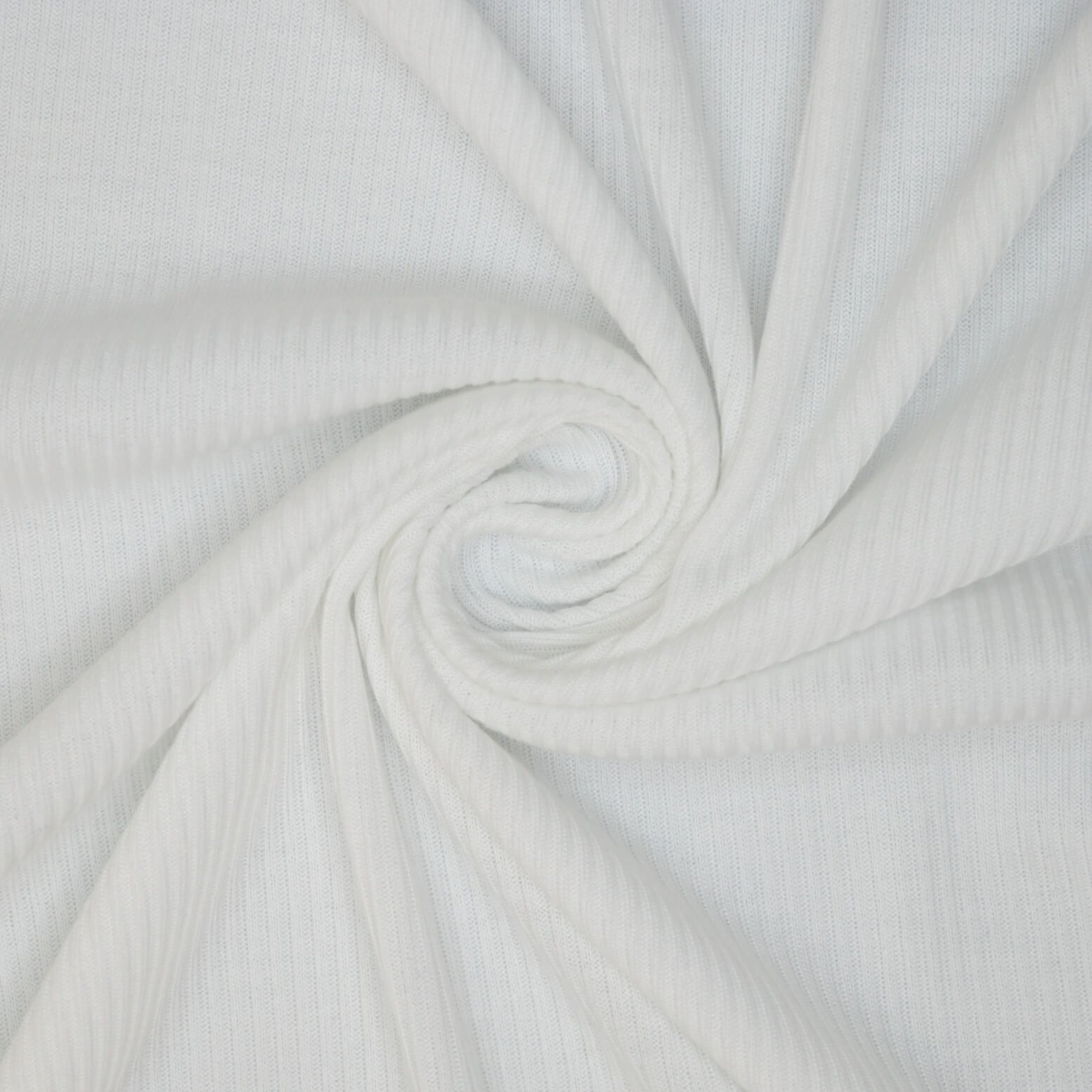 Our plain white ribbed jersey in crisp white, engineered for comfort and durability. The soft, two-way stretch construction moves with the body, making it ideal for fitted garments, activewear, and layering pieces. The distinctive ribbed texture adds visual interest whilst maintaining a clean aesthetic. Perfect for dressmakers and garment makers seeking reliable performance fabric with excellent recovery.